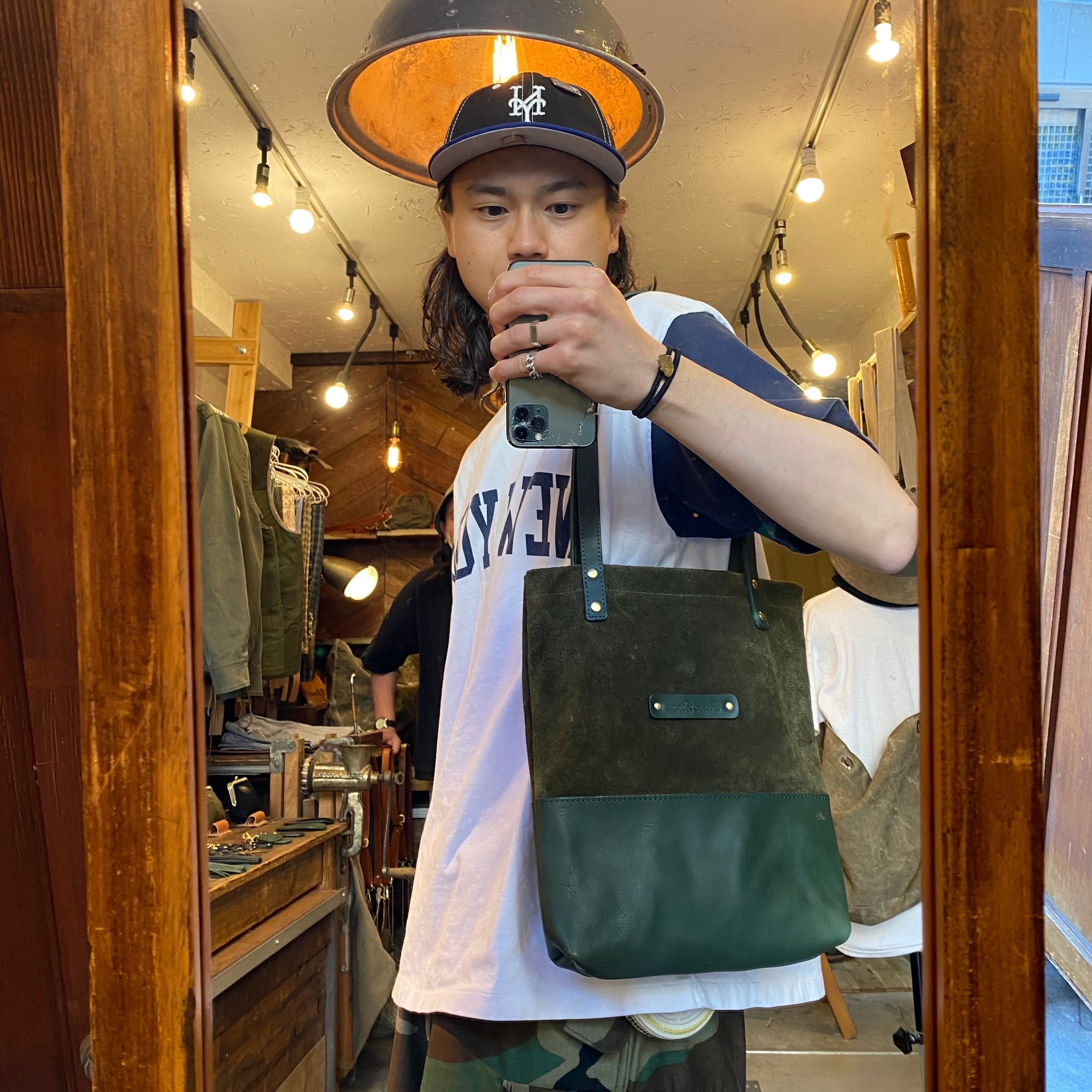 今回の新生地マットレザーと、肉厚なカウスエードとのコンビで制作されたツートーントートバッグ。