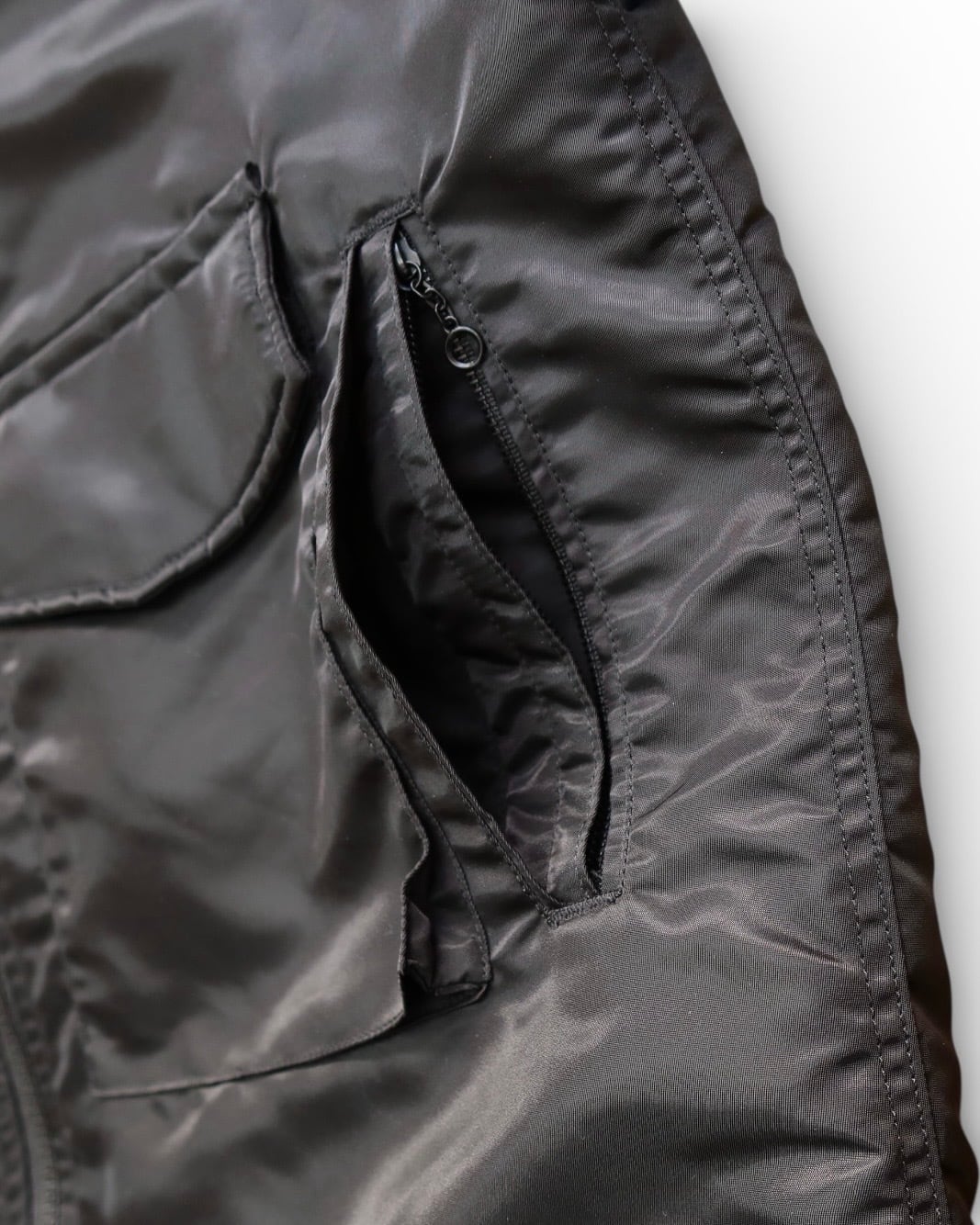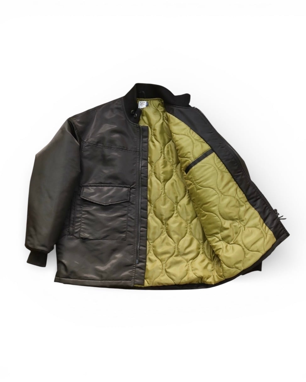90年代に様々なストリートブランドのOEMを担当していたSPIEWAK社から生まれたアイテムで、リアルミリタリーであるUS NAVY G-8 WEP JACKETの裾リブを排除し、ロング丈にモディファイする事で都会的なデザインにアップデートされています。今回はさらにLONGSETとの共作で作成し続けているダービージャケットの要素(カップインショルダー、2重構造のハンドウォーマーポケット)を追加したオリジナルデザインとなっています。内ポケットも含めると合計7カ所のポケットが有るのでたくさん物が入れる事が可能です。表地には撥水性、防風性に富んだナイロンツイル生地を使用。裏地は身頃から袖に至るまで中綿キルティング仕様にすることで軽量ながら高い保温性を備えています。