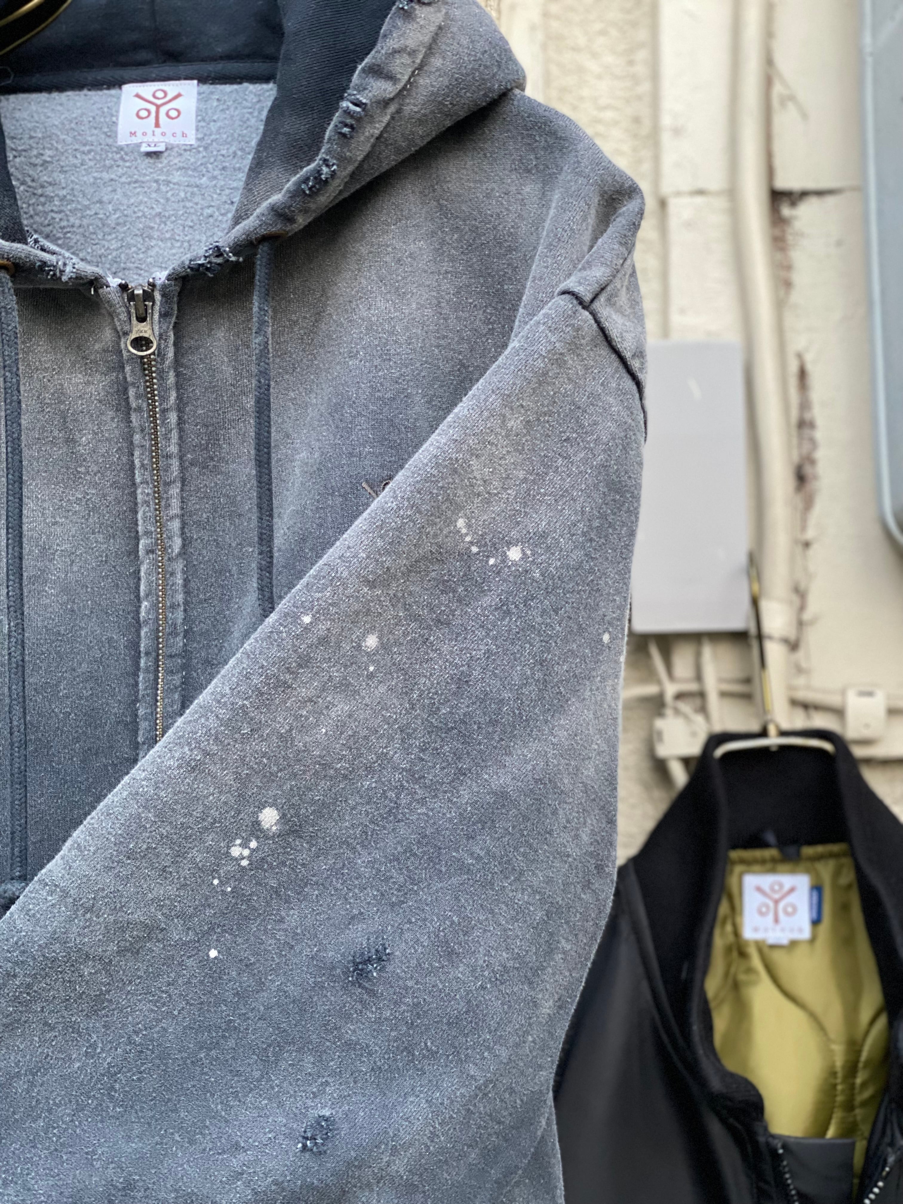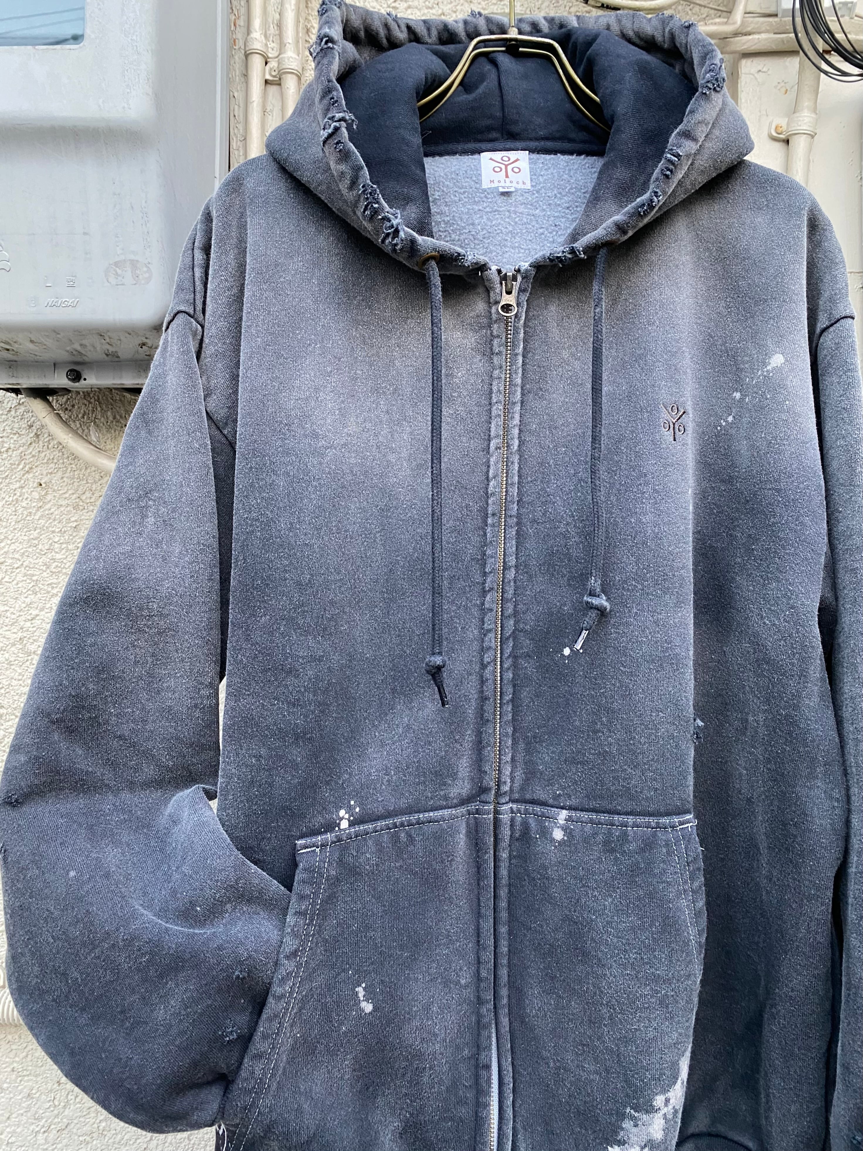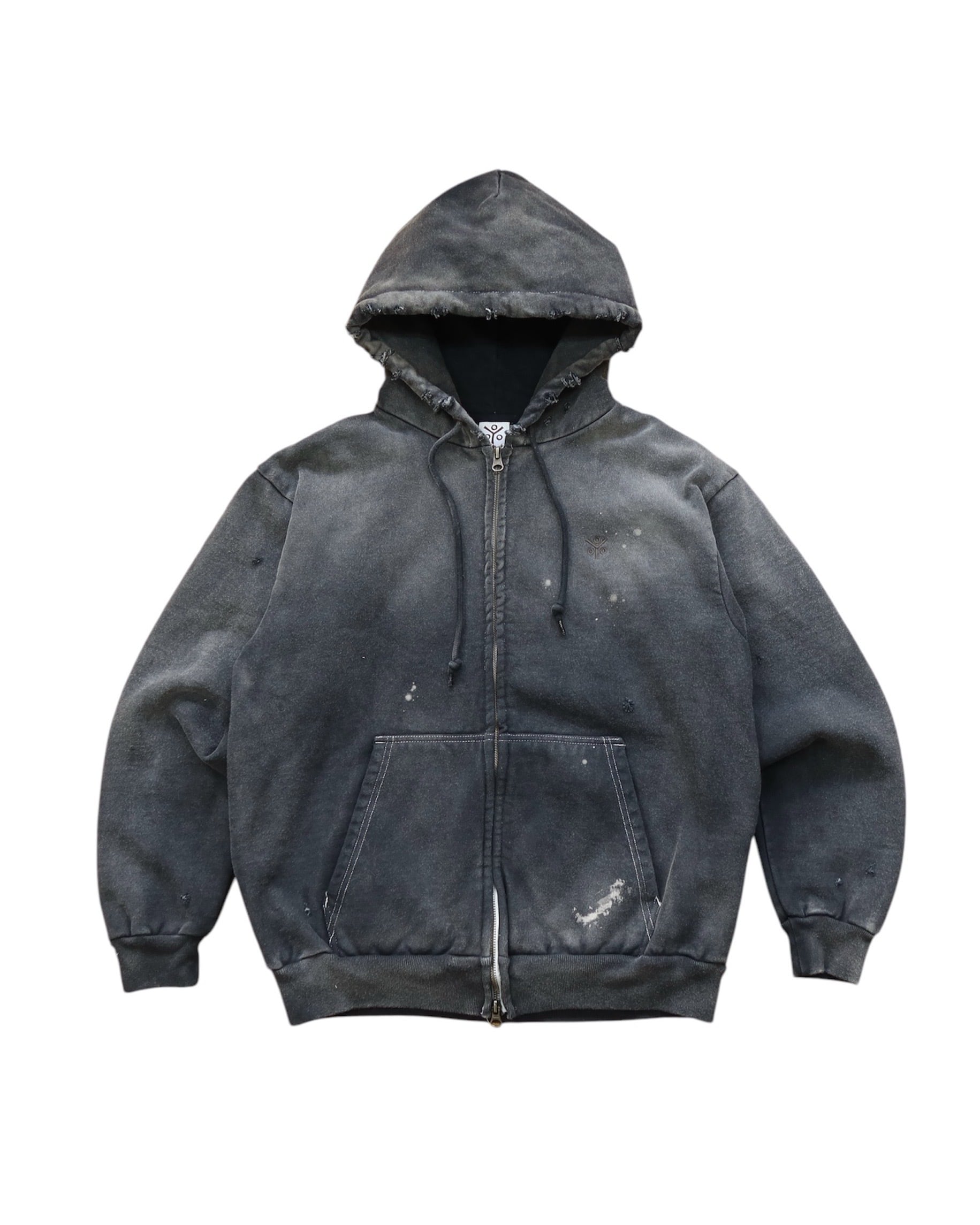 オープンエンド糸を使用した15.0オンスの厚手裏起毛スウェット生地を使用しています。製品硫化染めにてブラックに染め上げた後に、スプレーブリーチ、サンフェード、ダメージ加工を加えています。