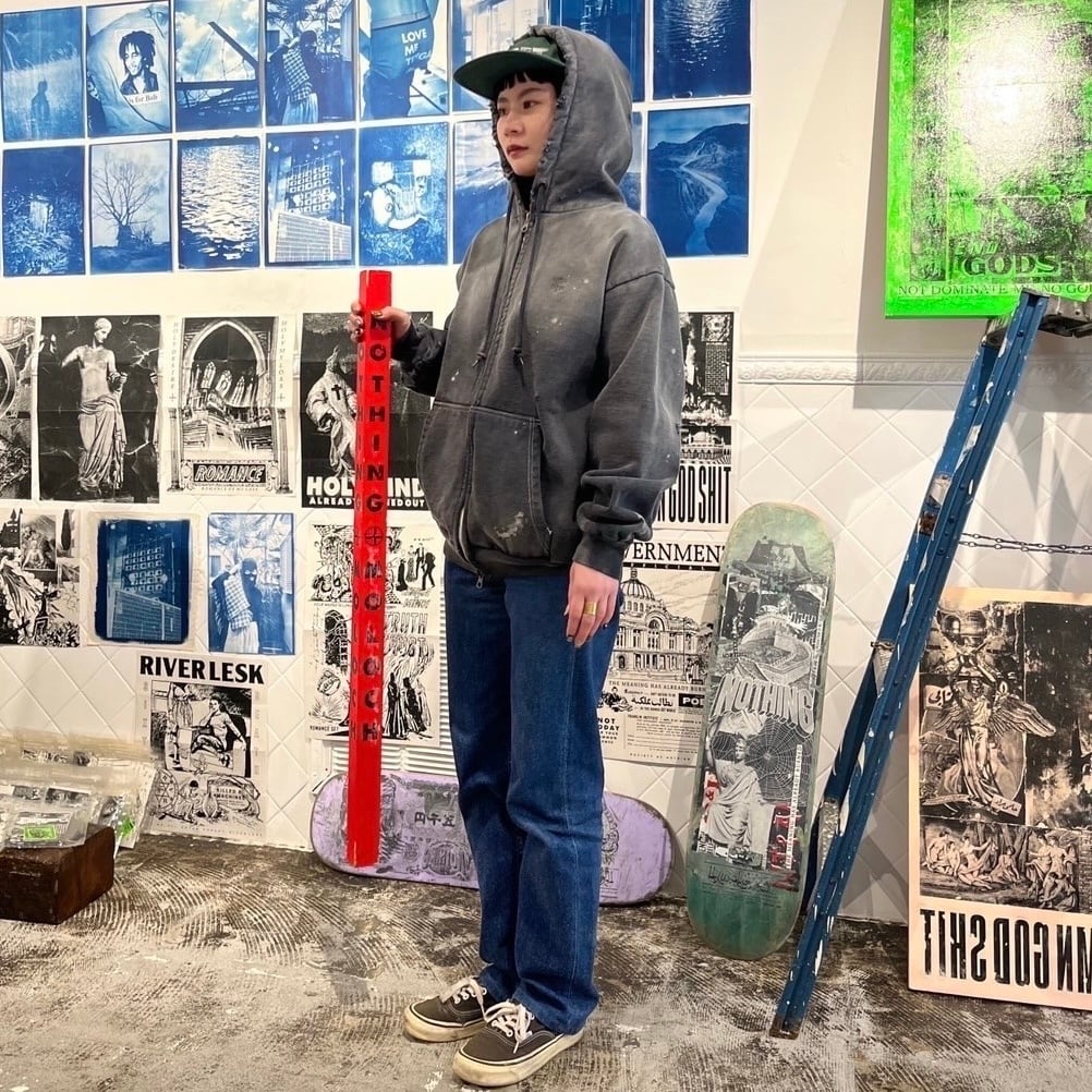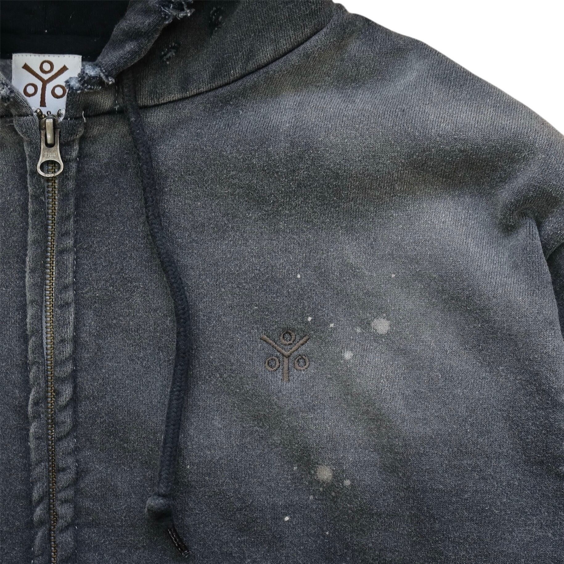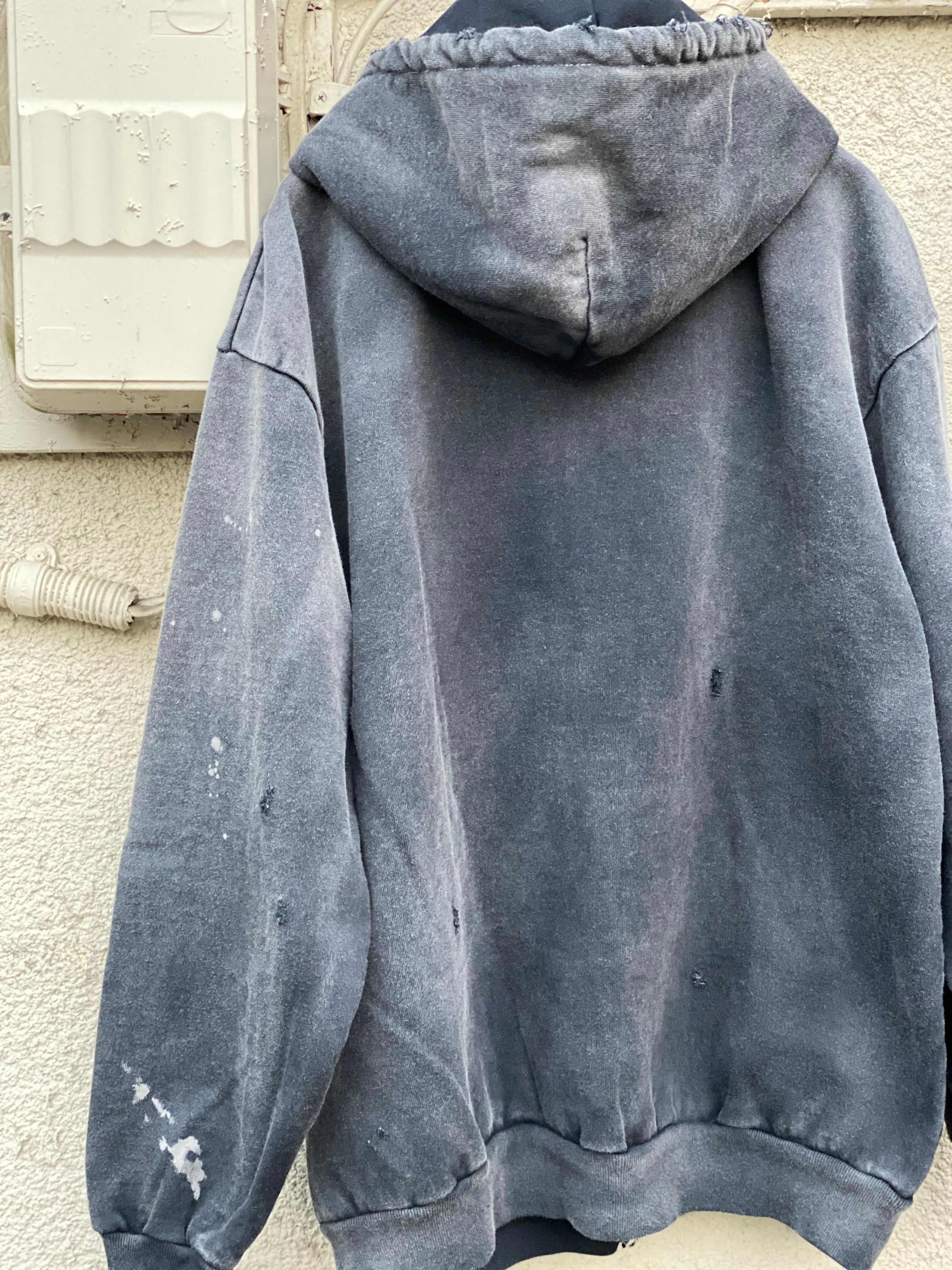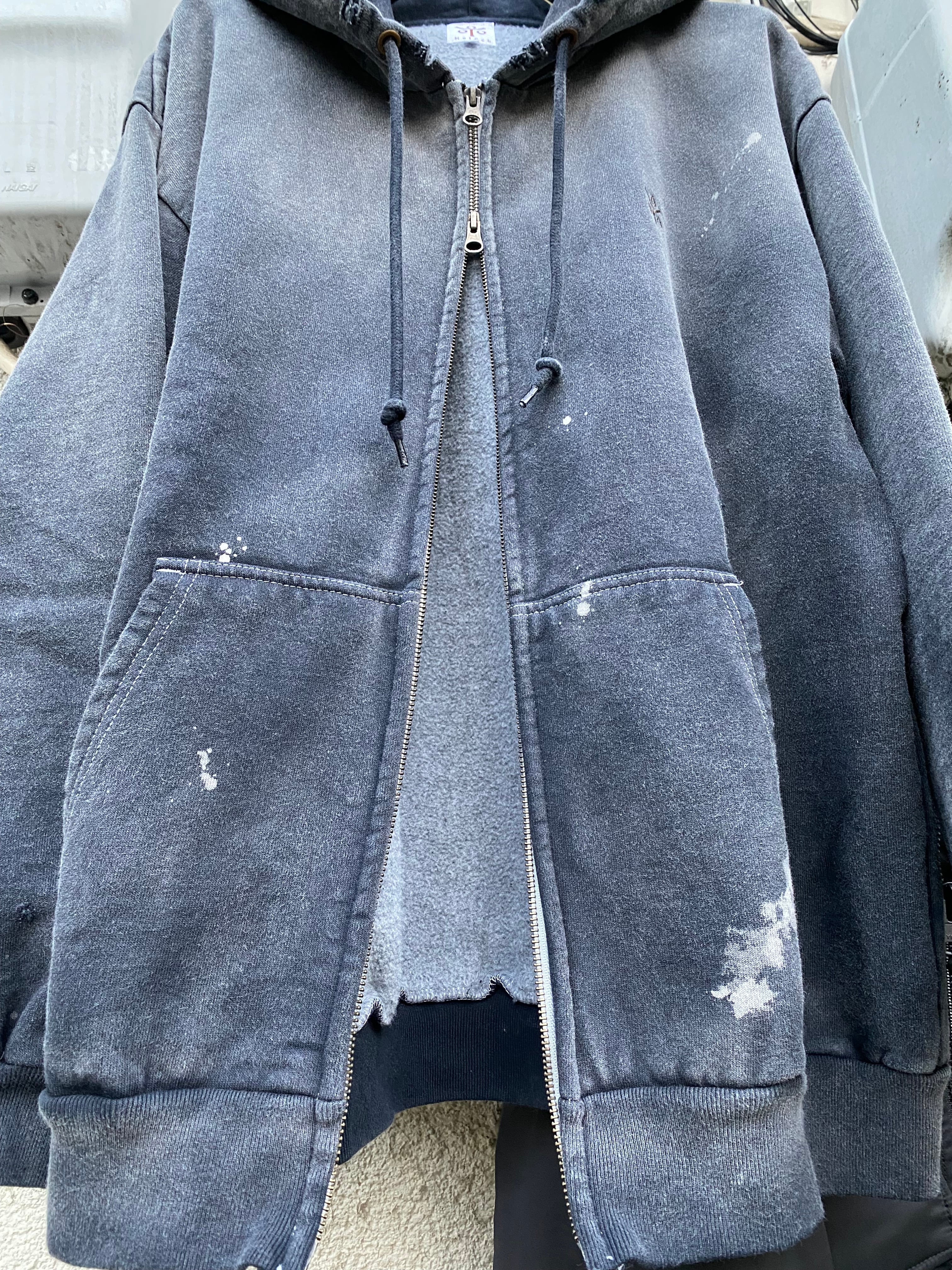 オープンエンド糸を使用した15.0オンスの厚手裏起毛スウェット生地を使用しています。製品硫化染めにてブラックに染め上げた後に、スプレーブリーチ、サンフェード、ダメージ加工を加えています。