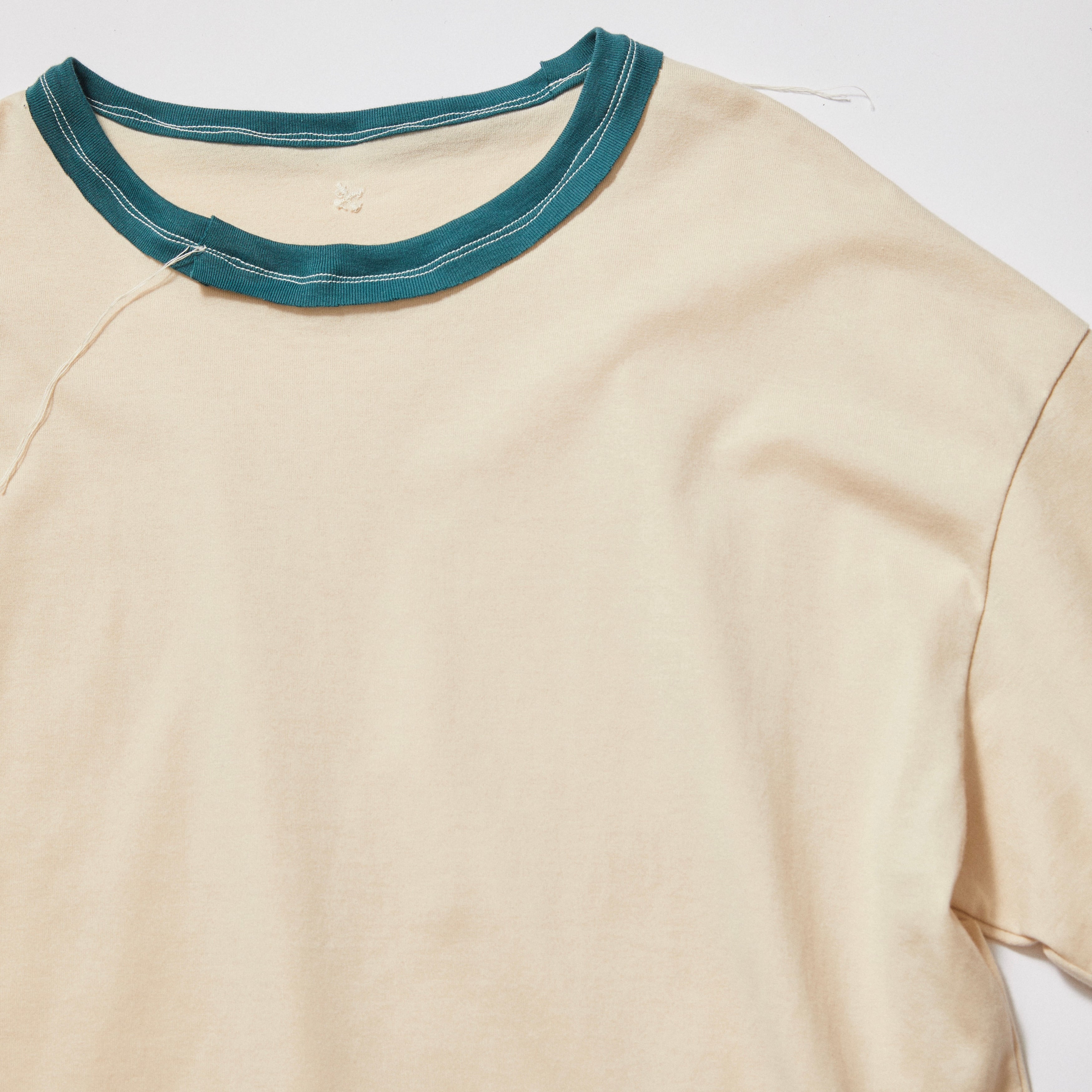 ネックラインに施したカットオフと継ぎ接ぎが、ベーシックなTシャツに脱構築的なニュアンスを与えています。