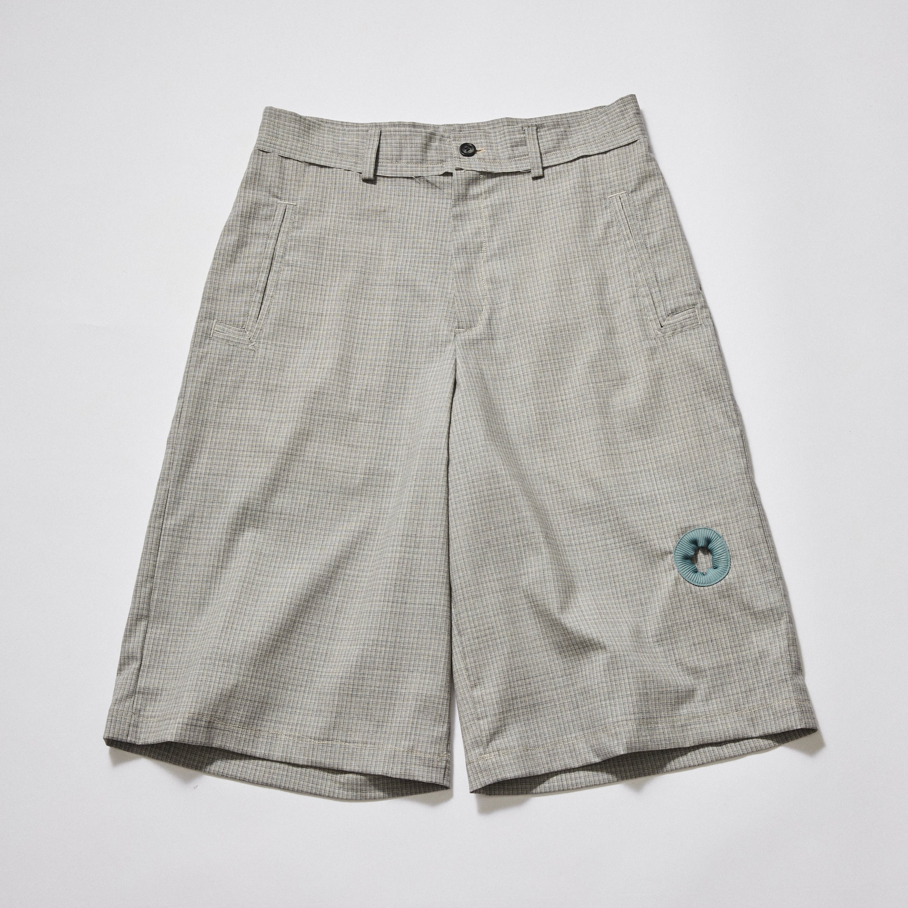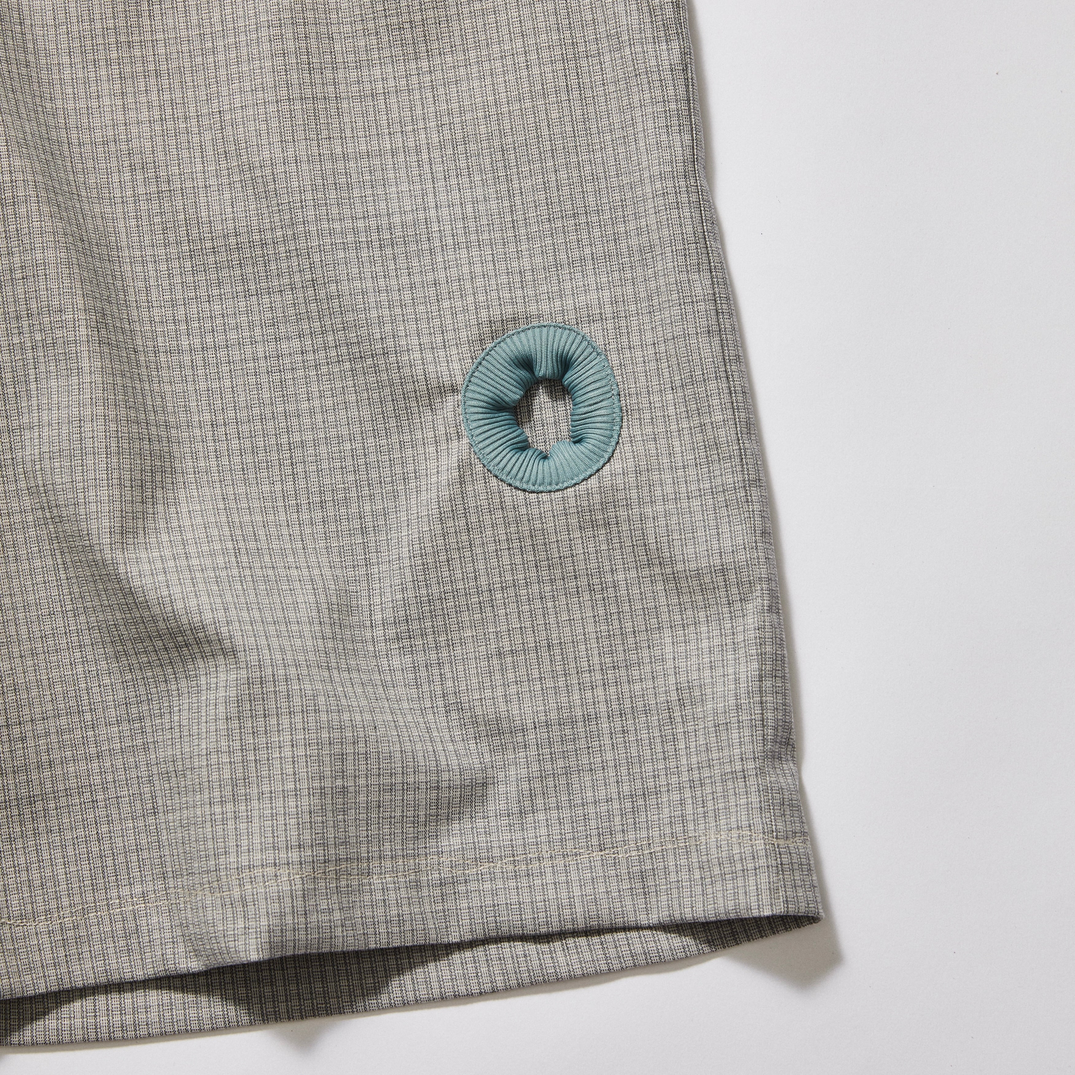 アメリカ軍の低温帯用フライトスーツに見られる、機器ケーブルを通すホールのリブニットディテールから着想を得たハーフパンツ。