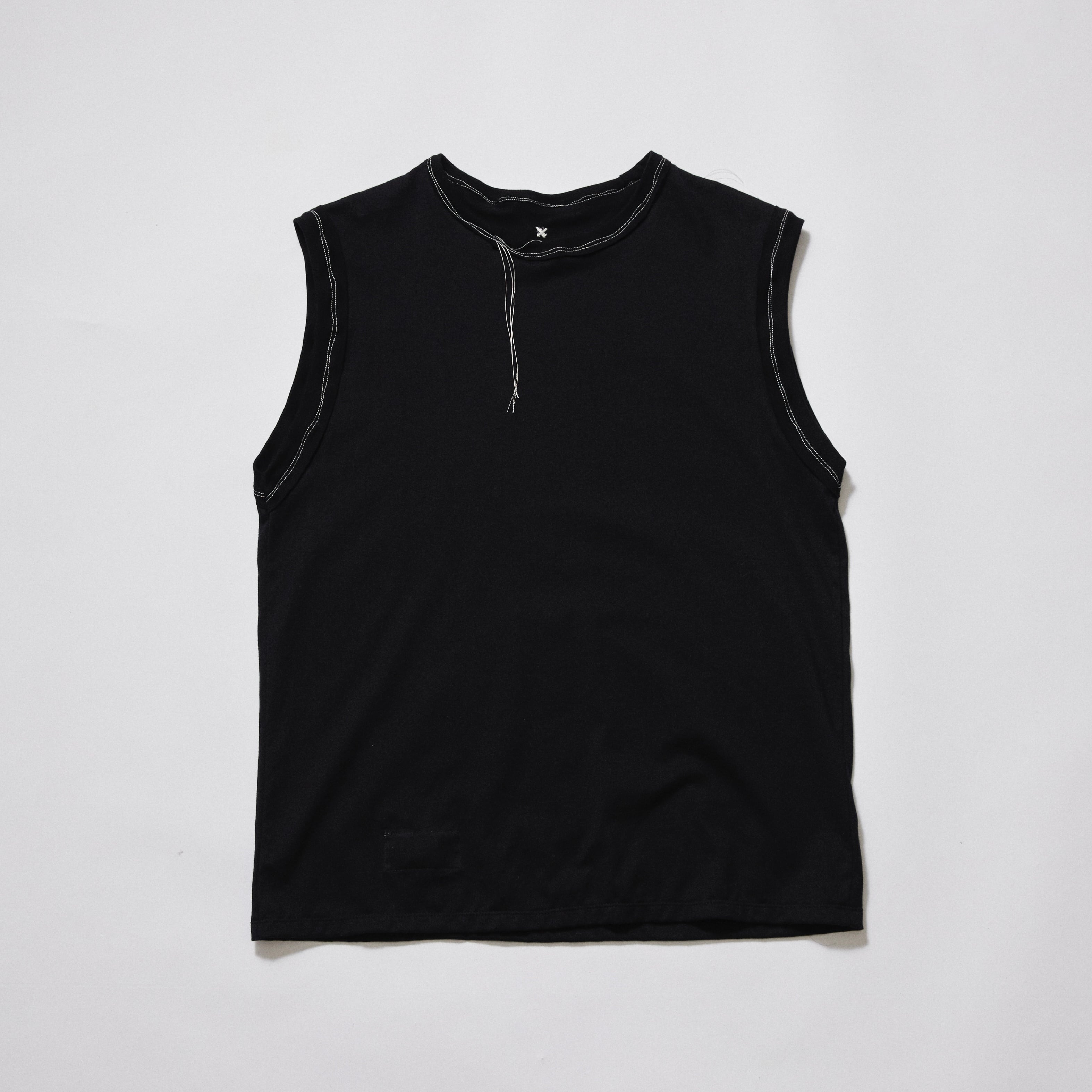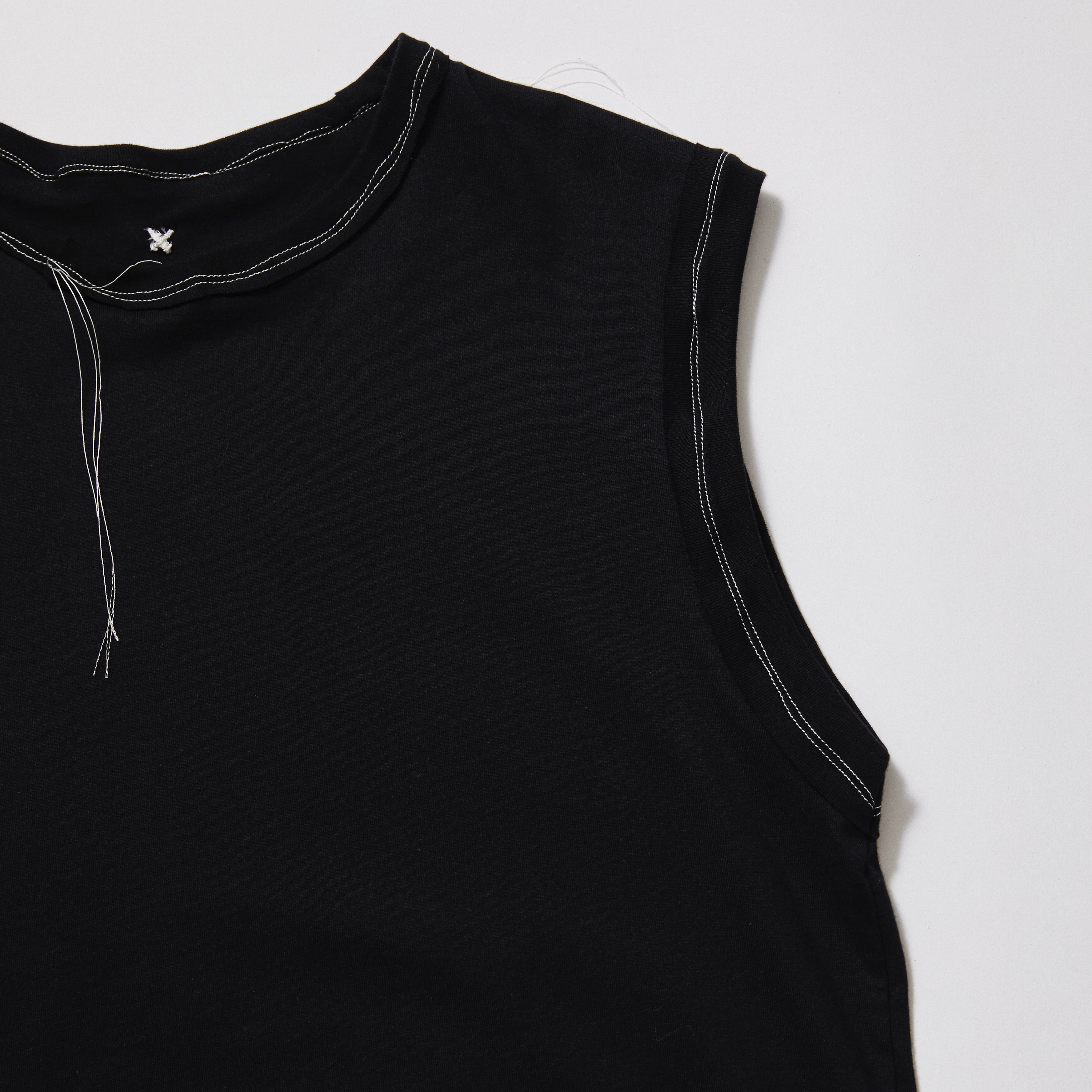 無造作ではなく緻密に計算された切り替えによって、スタンダードをズラしつつも絶妙なバランスを確立。日常に馴染むシンプルさの中にモード的な違和感を共存させたデザインノースリーブカットソーです。