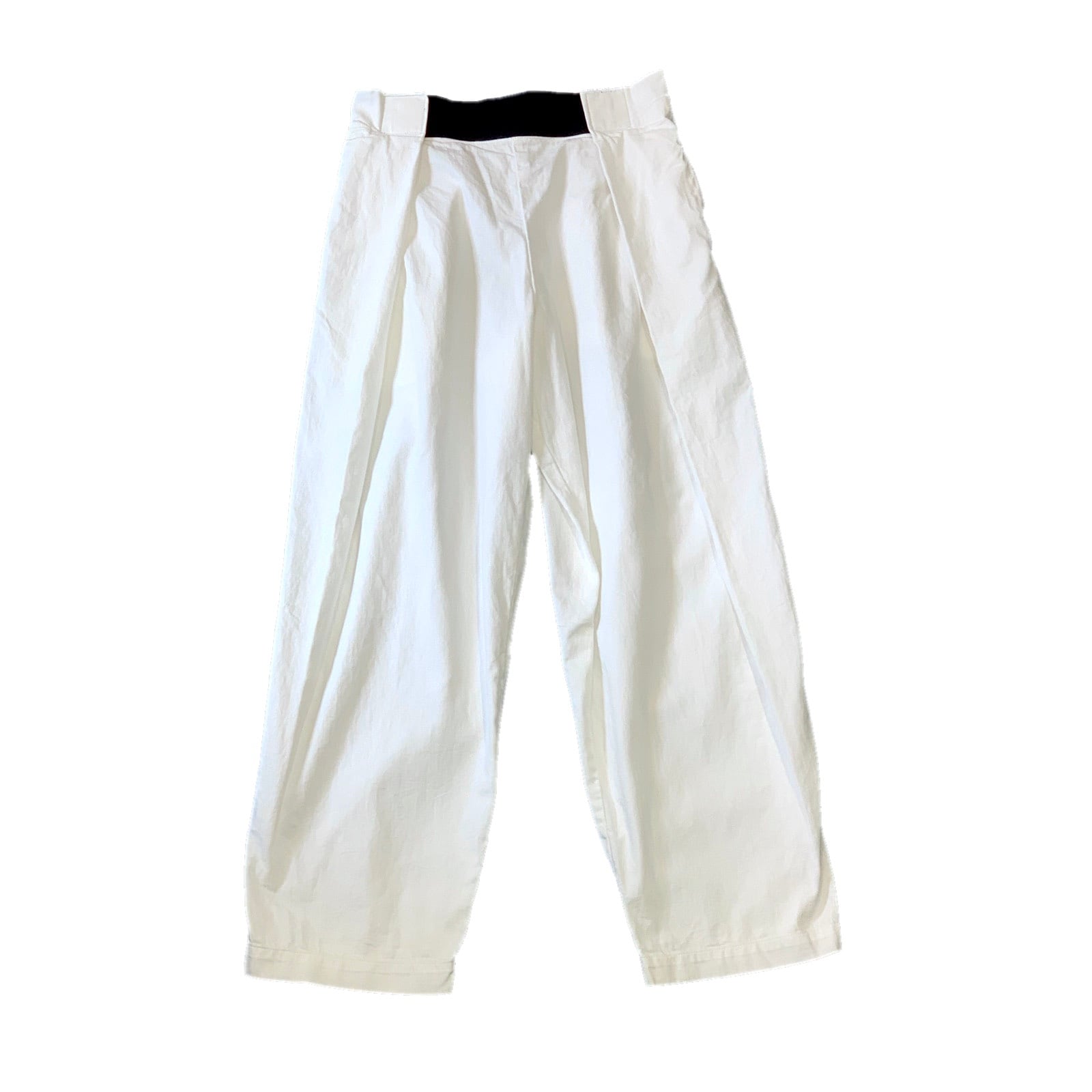 太めで、一瞬センタープリーツが入ってるような新しい型のパンツ。