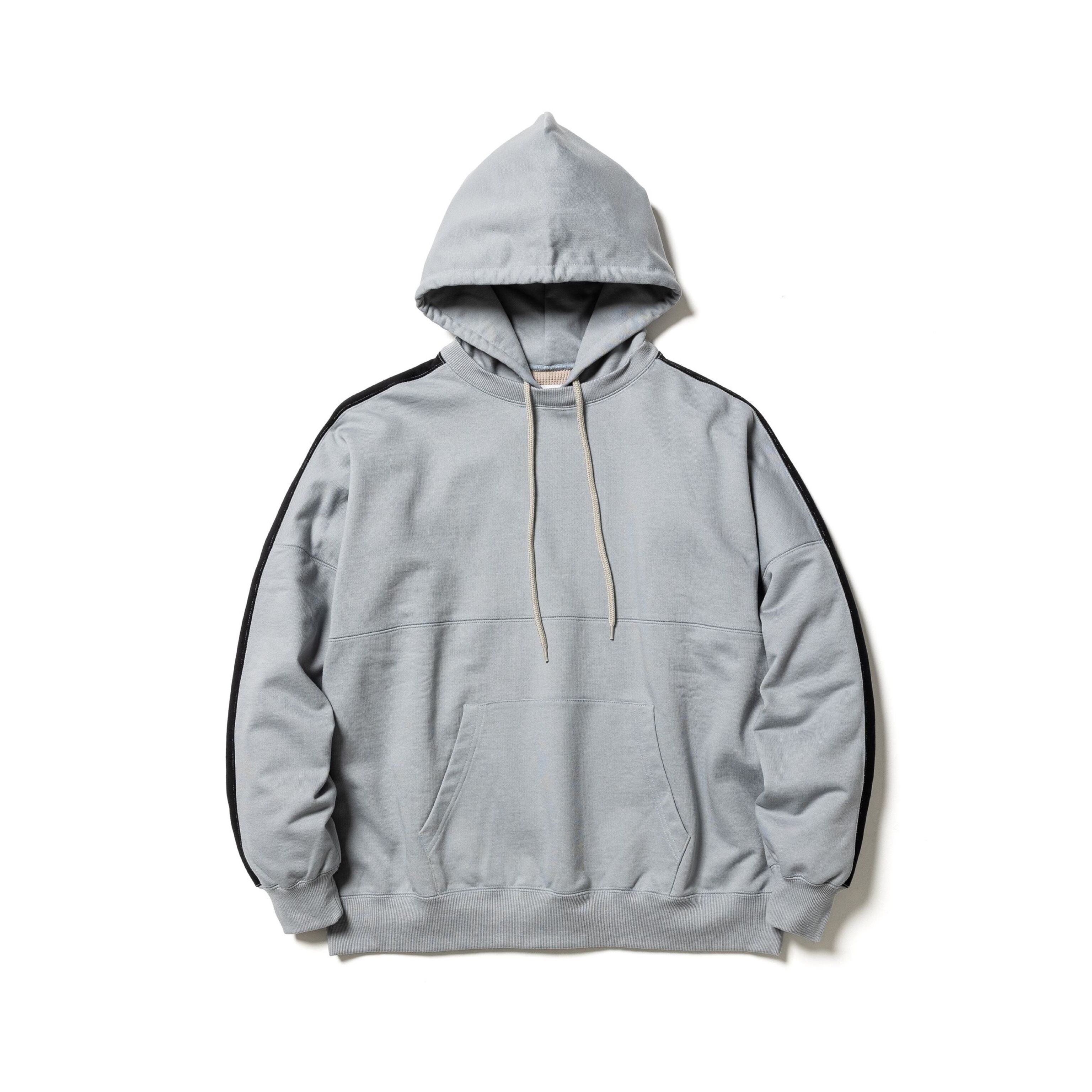 袖のラインが特徴的な、後付けフードのビッグサイズフーディー。