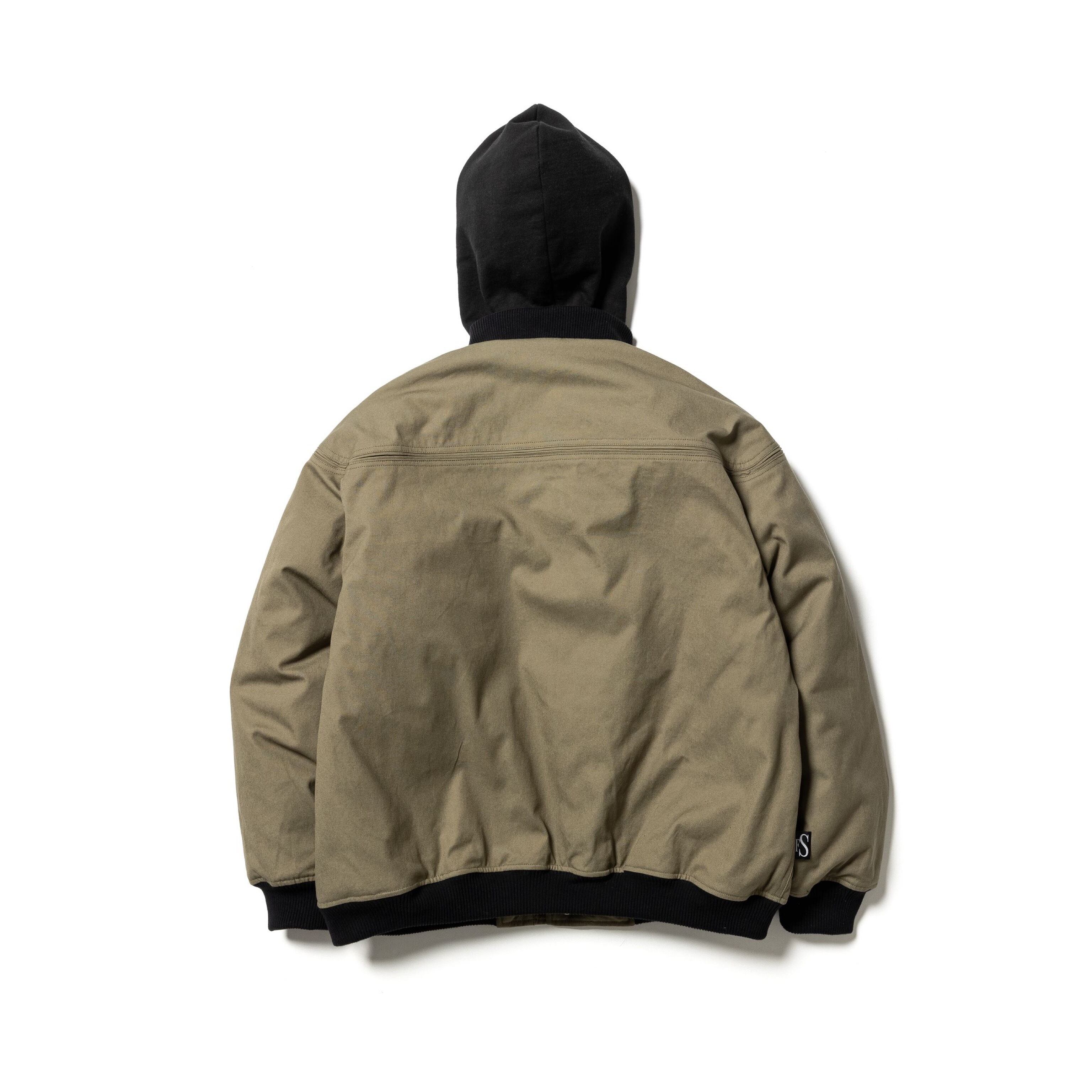 FLAGSTUFFオリジナルスウェット素材のフードとタフなダックボディのレイヤードデザイン。