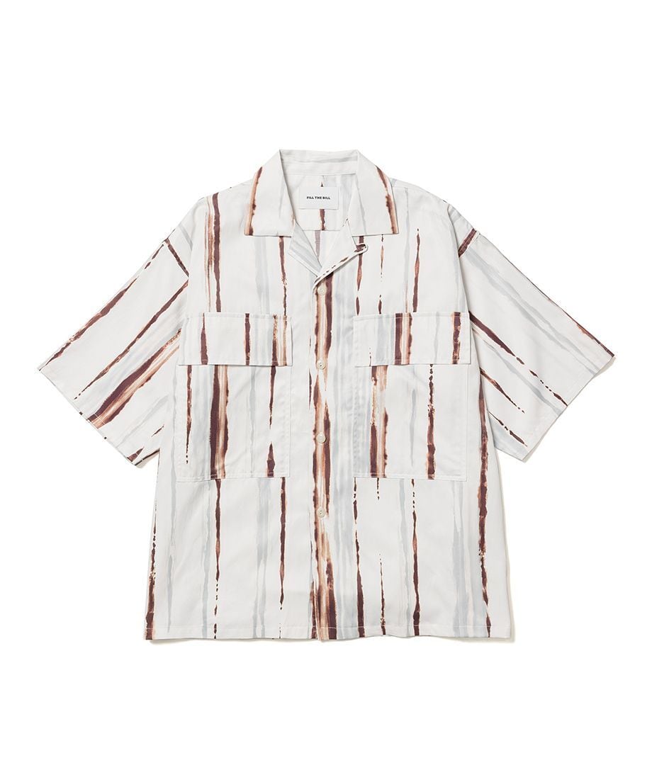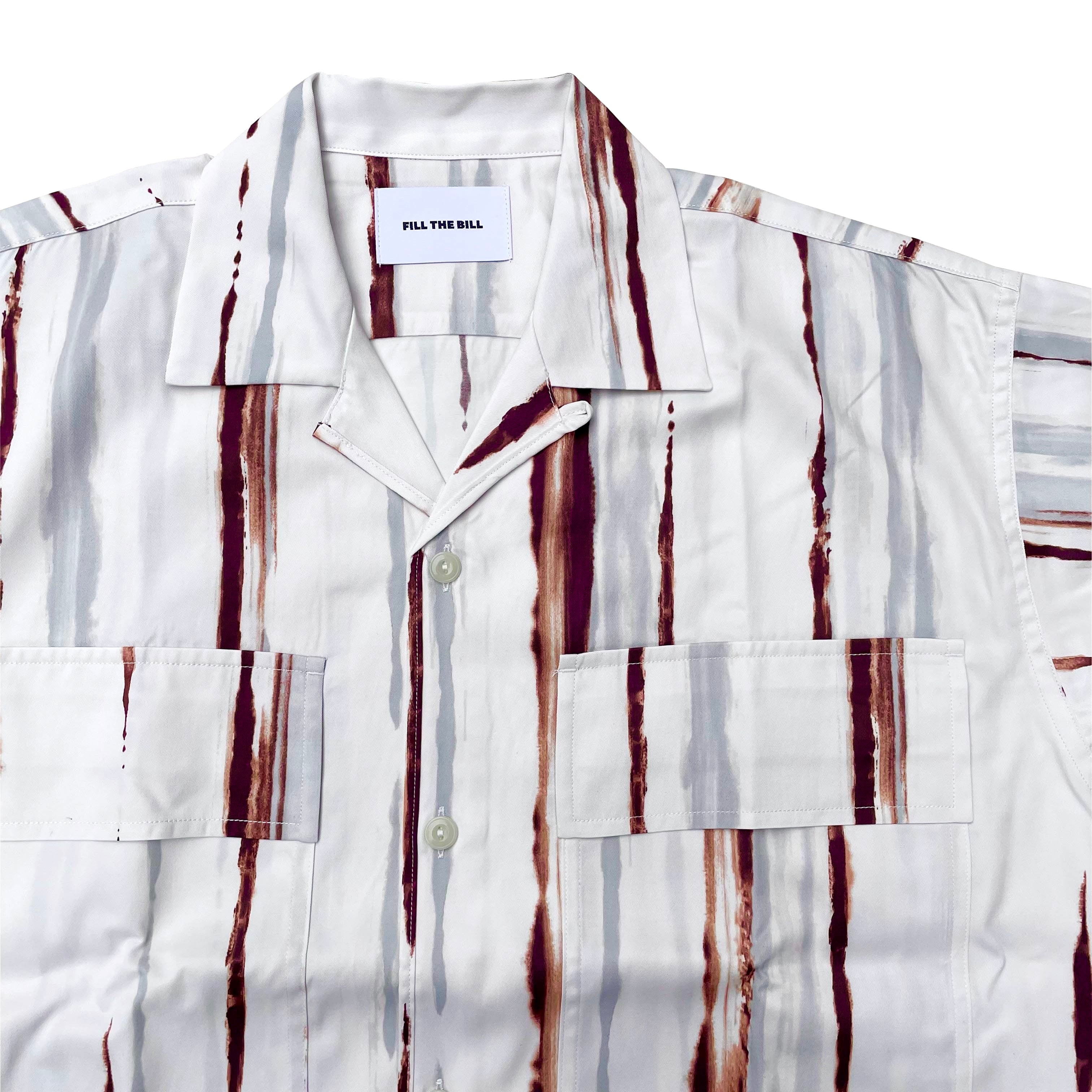 オリジナルプリントのストライプ柄オープンカラーシャツ。