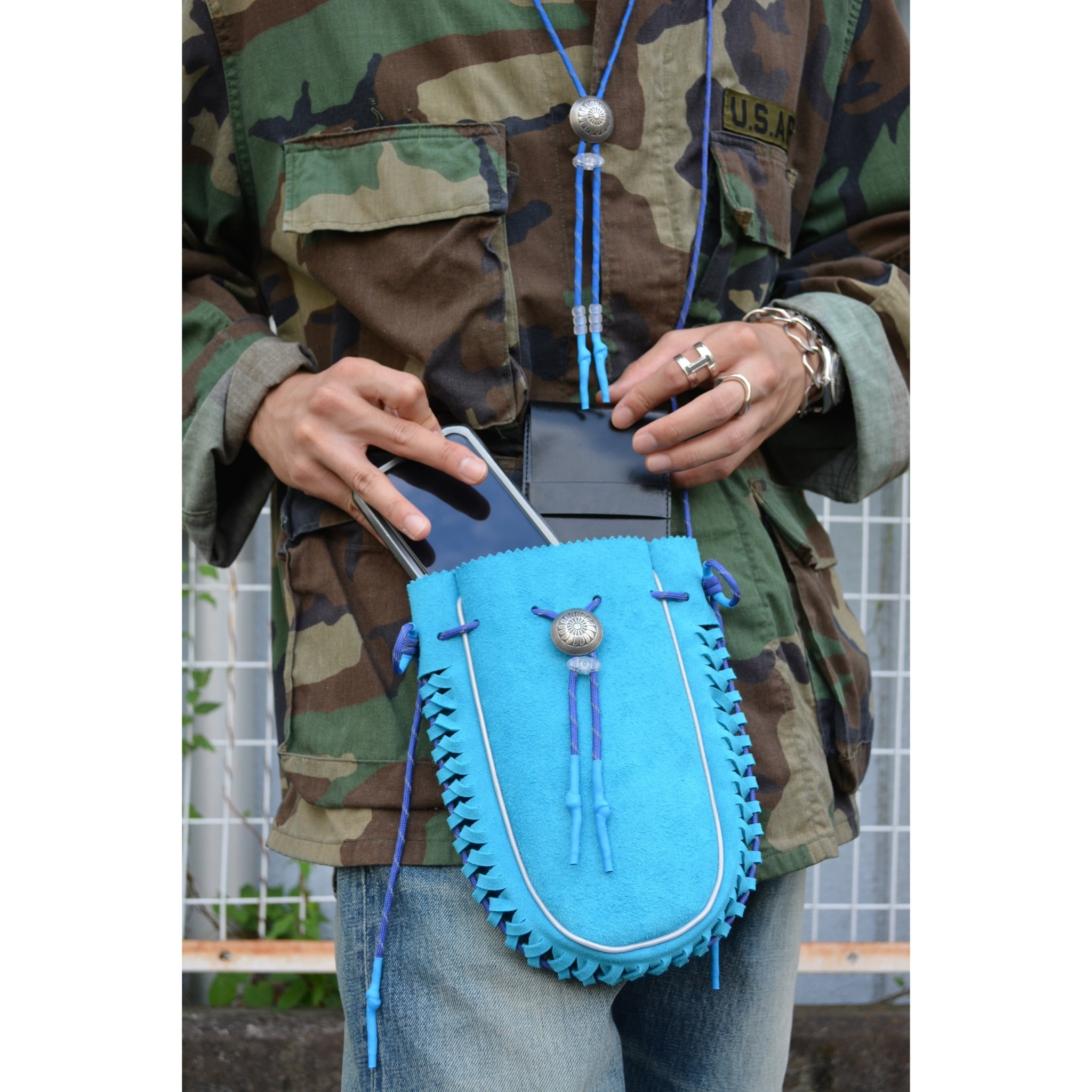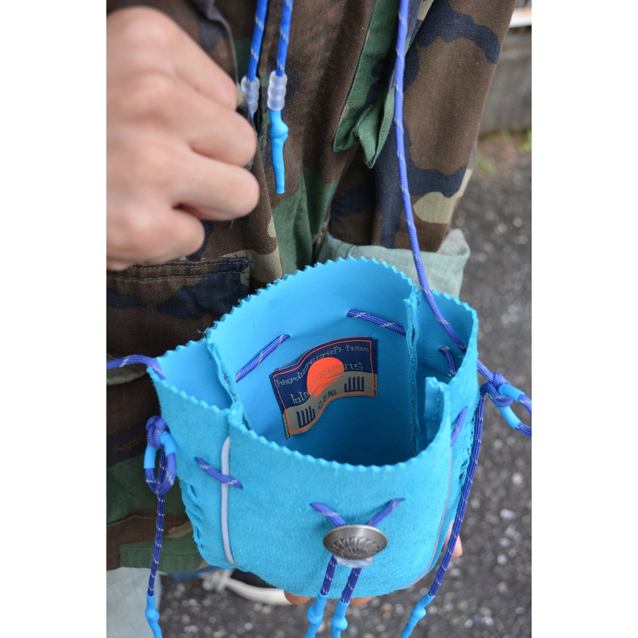 スウェードレザー、編み込み、コンチョといったネイティブなイメージと、対照的に現代的イメージを持つ、リフレクター付きパラコードを使用したメディスンポーチ。