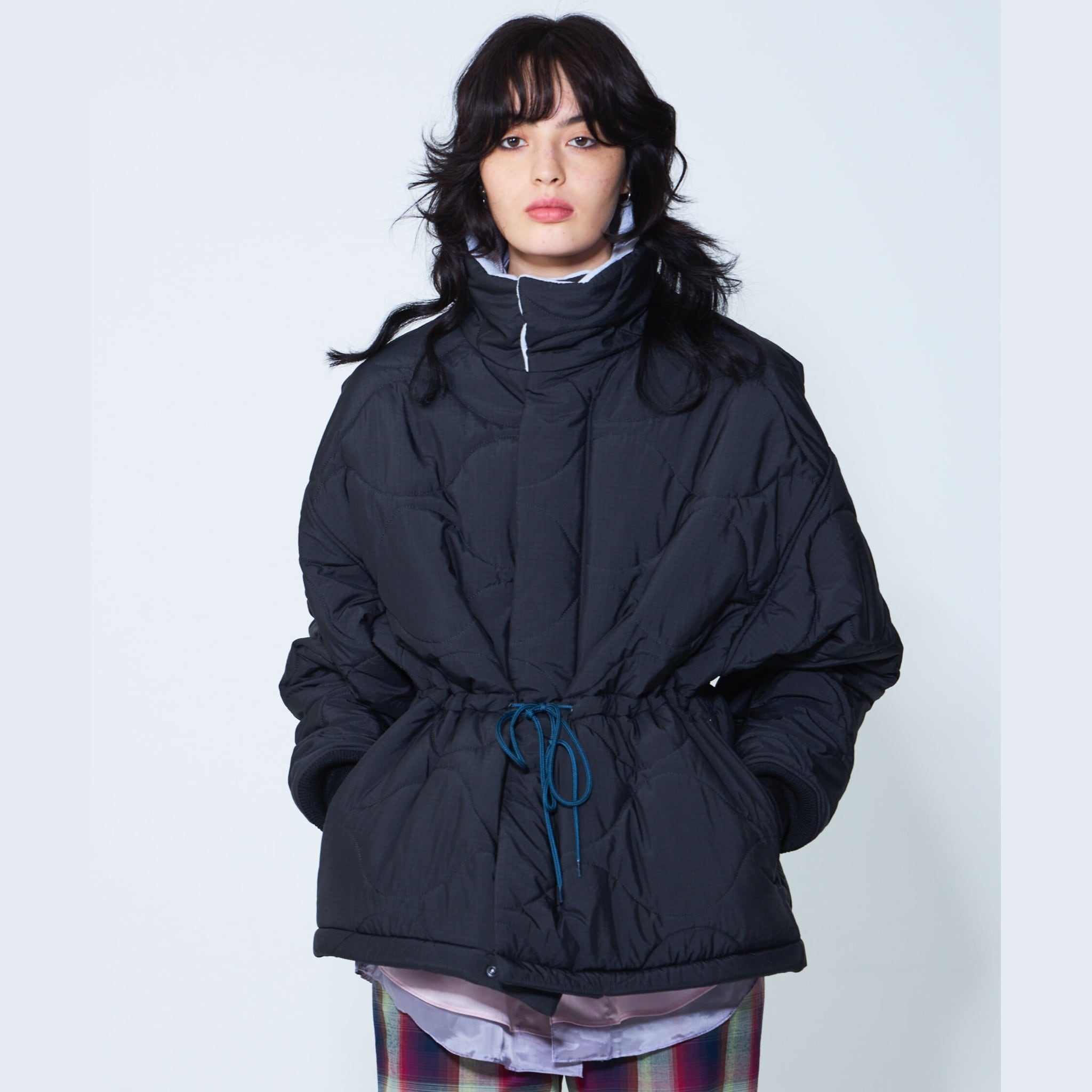 表は DAIICHI ORIMONOのDICROSdewリップストップ、裏側にオリジナルのサーマル素材をキルトし、表裏柔らかい素材なのでウエストを絞っても違和感のないシワで、キルティングでありがちなハリ感を極力抑えたアイテム。