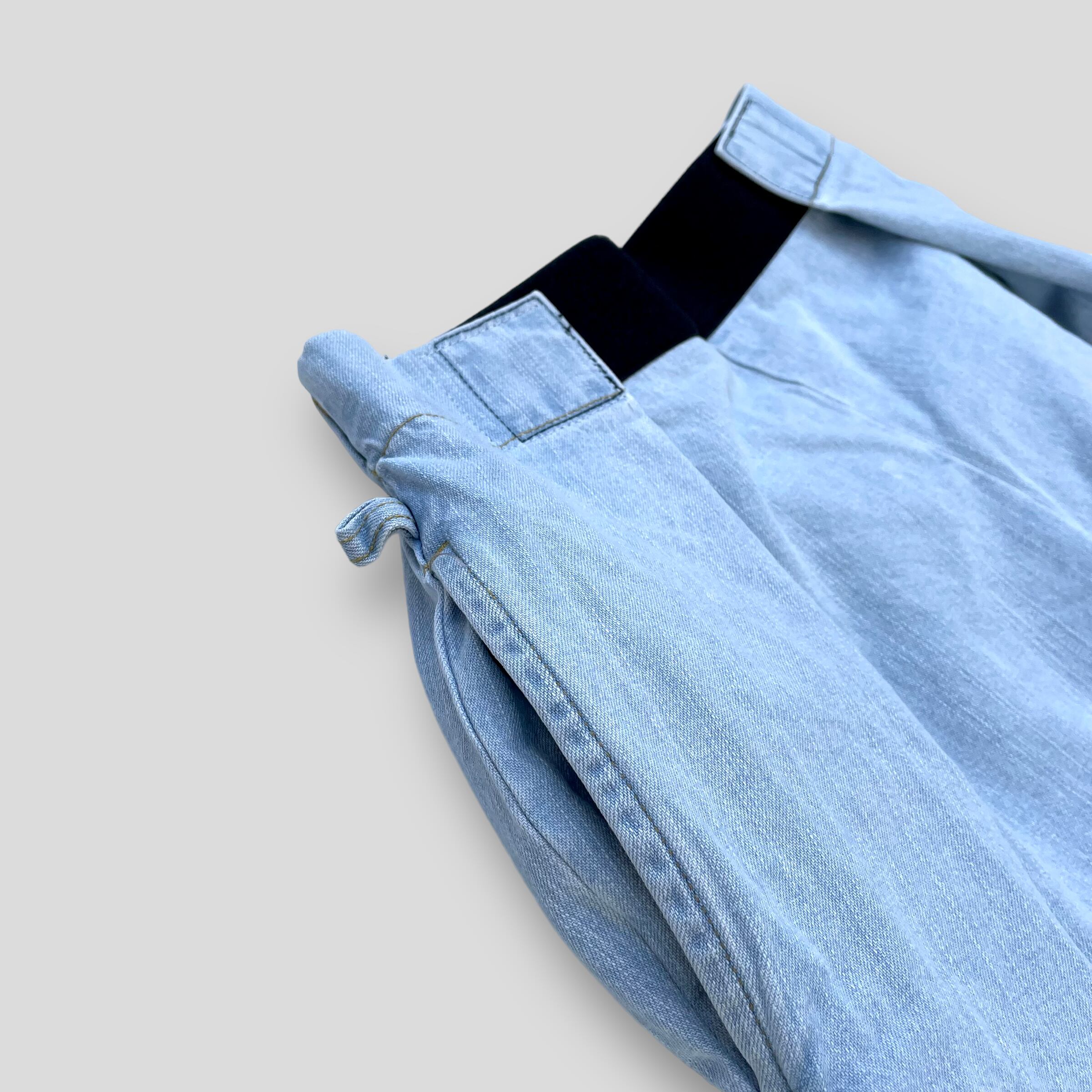 ウエストがマジックテープで調節ができて、後ろ身頃は太いゴムになってて半分イージーパンツのように簡単に着脱できます。