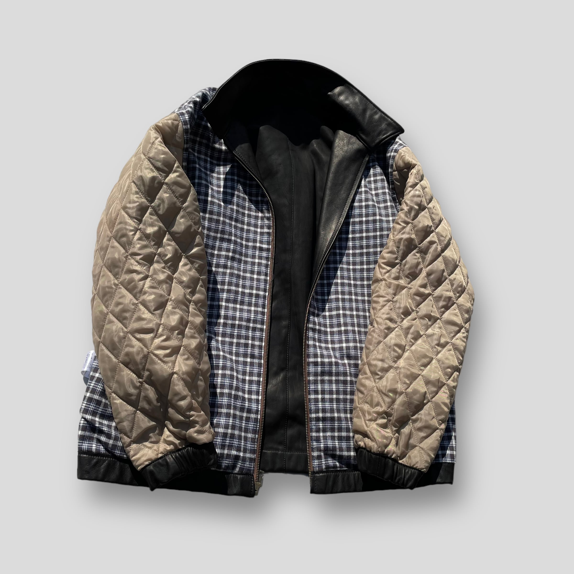 職業柄古着の倉庫を趣味で見に行くのですが、裏地チェックだと!ってなるので、ネイビー、ブラウンの渋いフランネルチェックに袖裏はワークブルゾン御用達の安く薄いキルティングを付けましたー