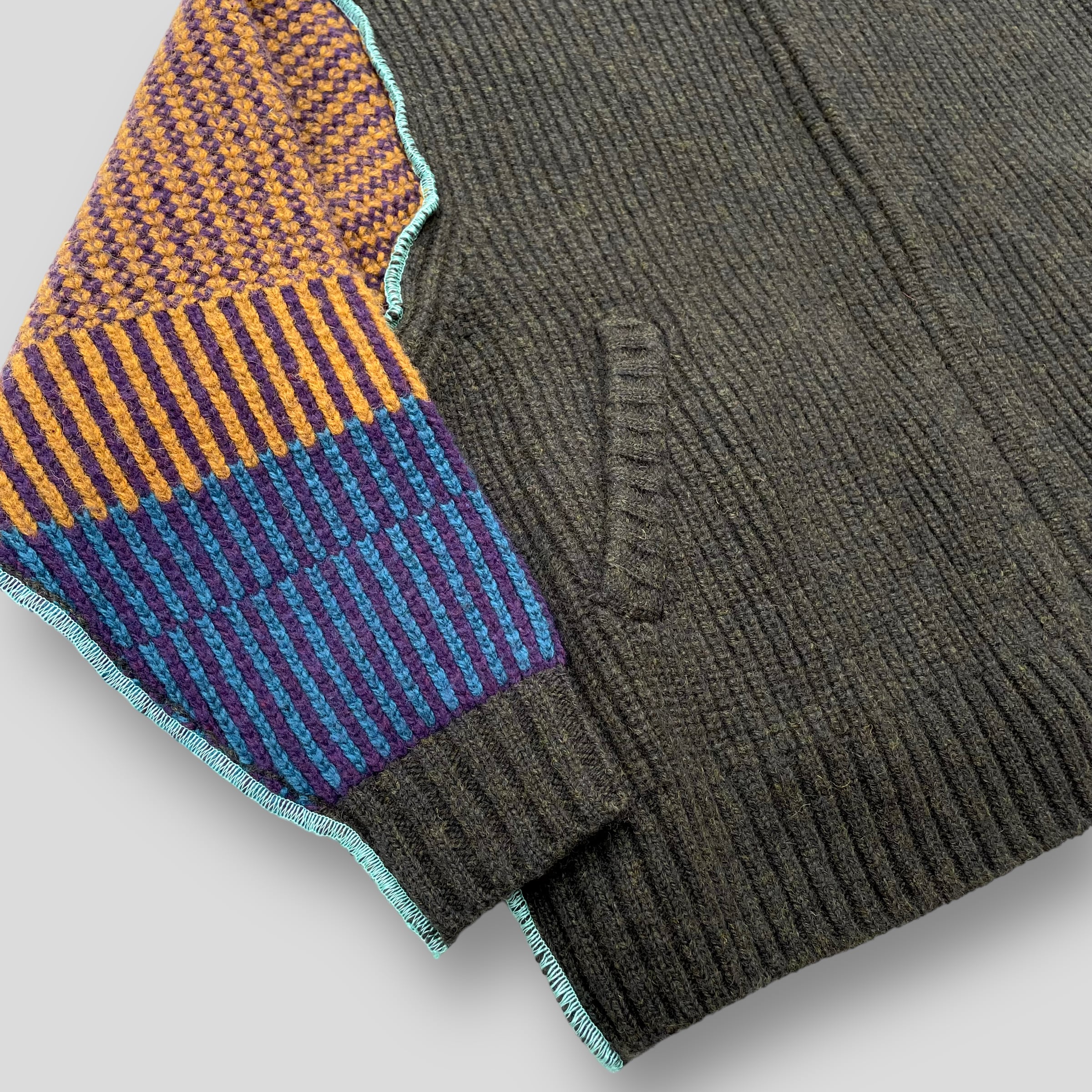 複雑な柄と配色のデザインステッチでアクセントをつけたアイテム。