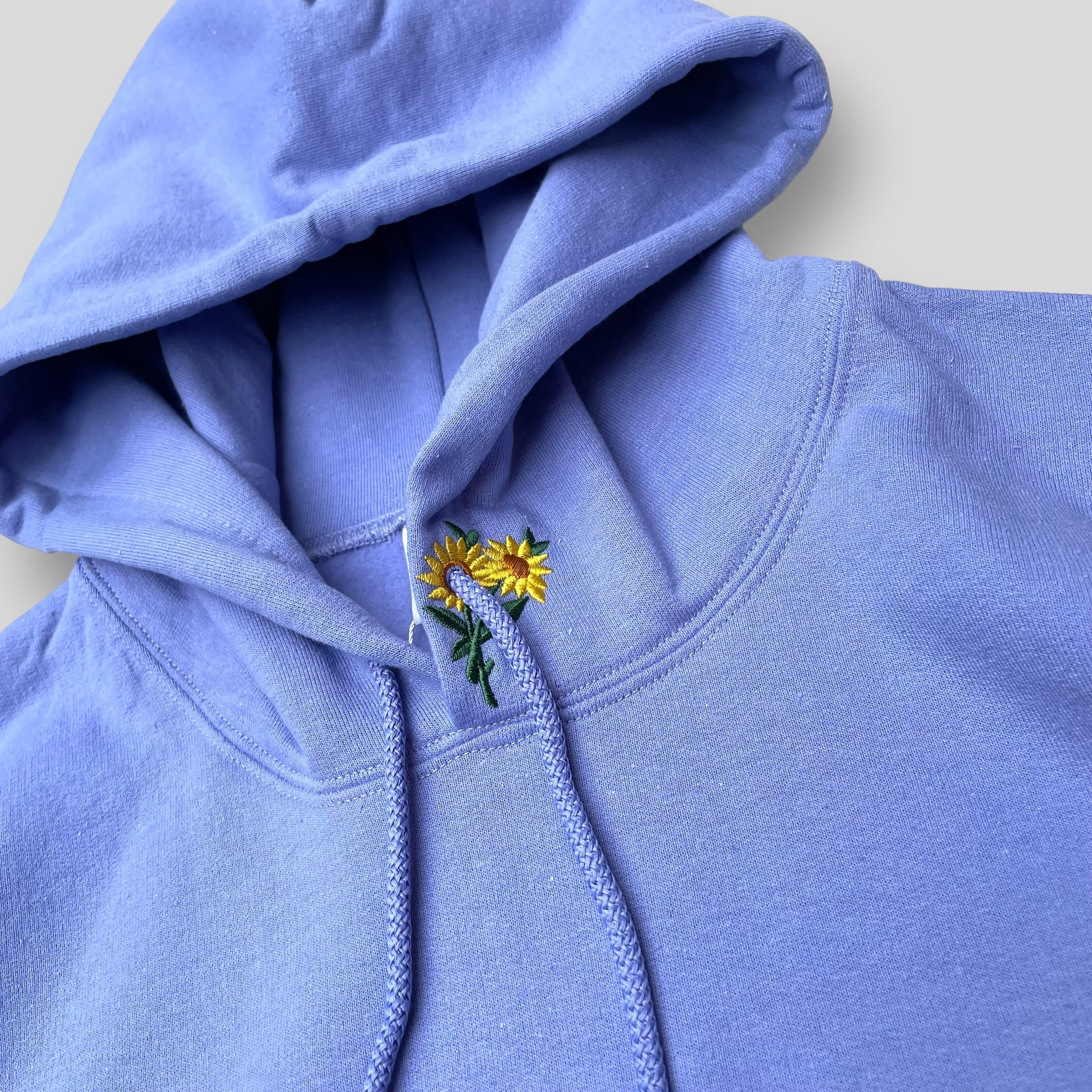 GILDANの8oz裏起毛スウェットパーカーをベースにフードをとりはずし、フラワーモチーフのフードひもが通るように穴付きの刺繍を施し、またフードをつけてもらう。