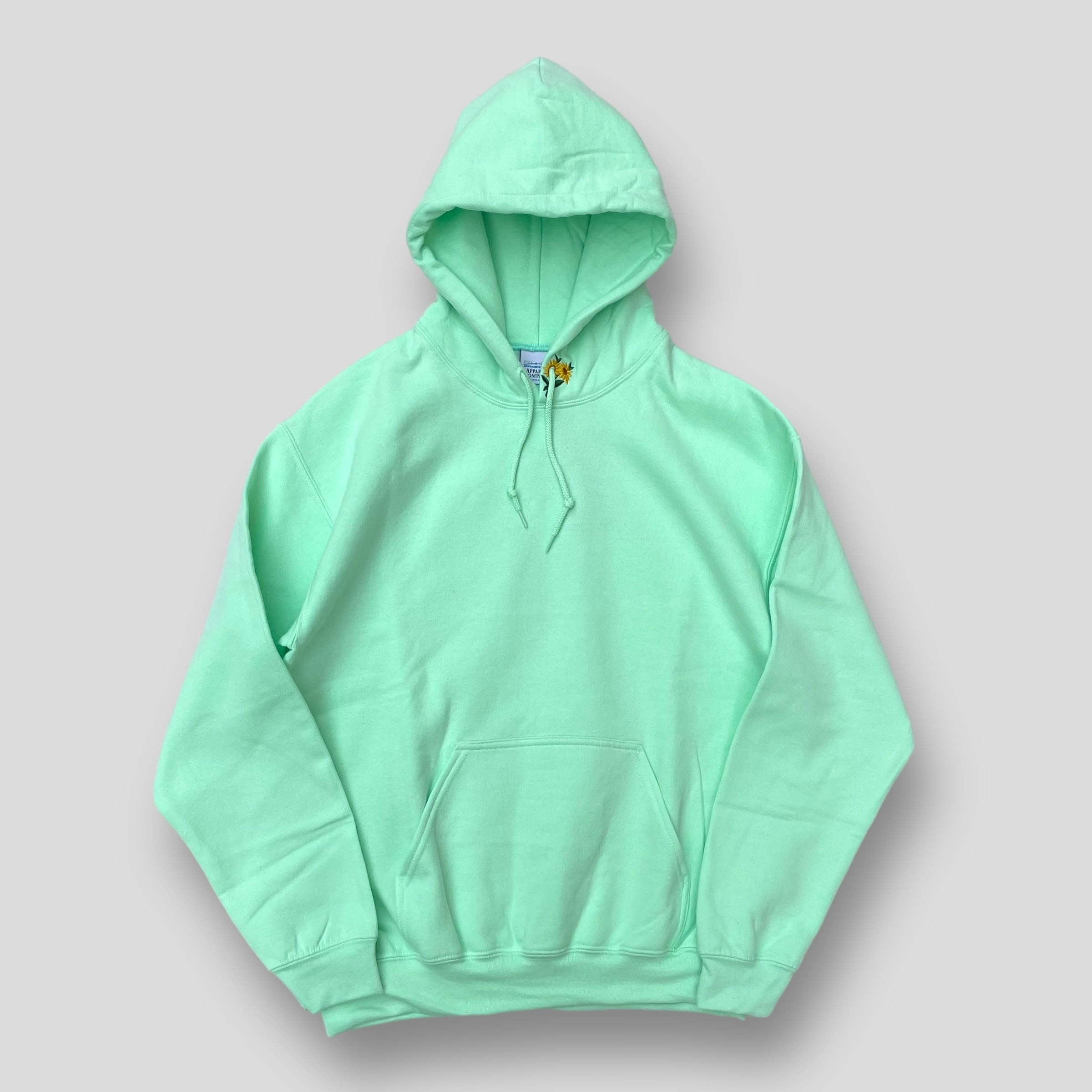 GILDANの8oz裏起毛スウェットパーカーをベースにフードをとりはずし、フラワーモチーフのフードひもが通るように穴付きの刺繍を施し、またフードをつけてもらう。