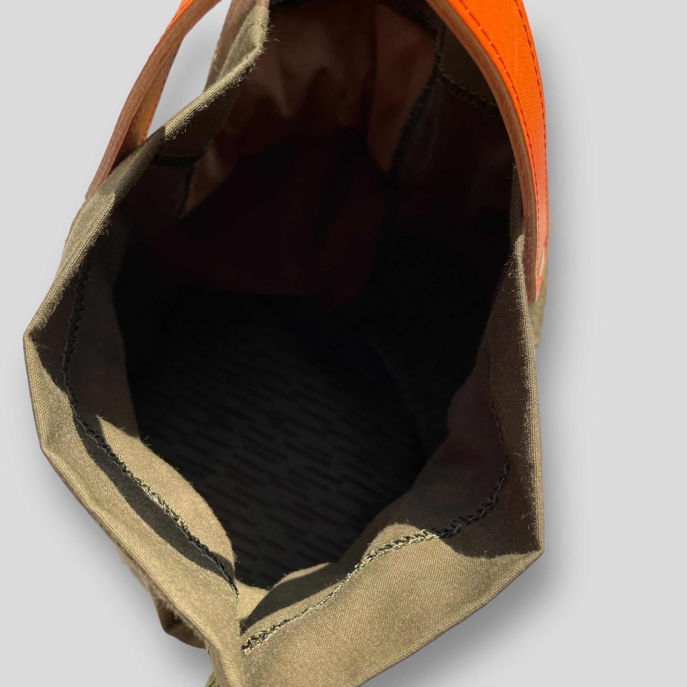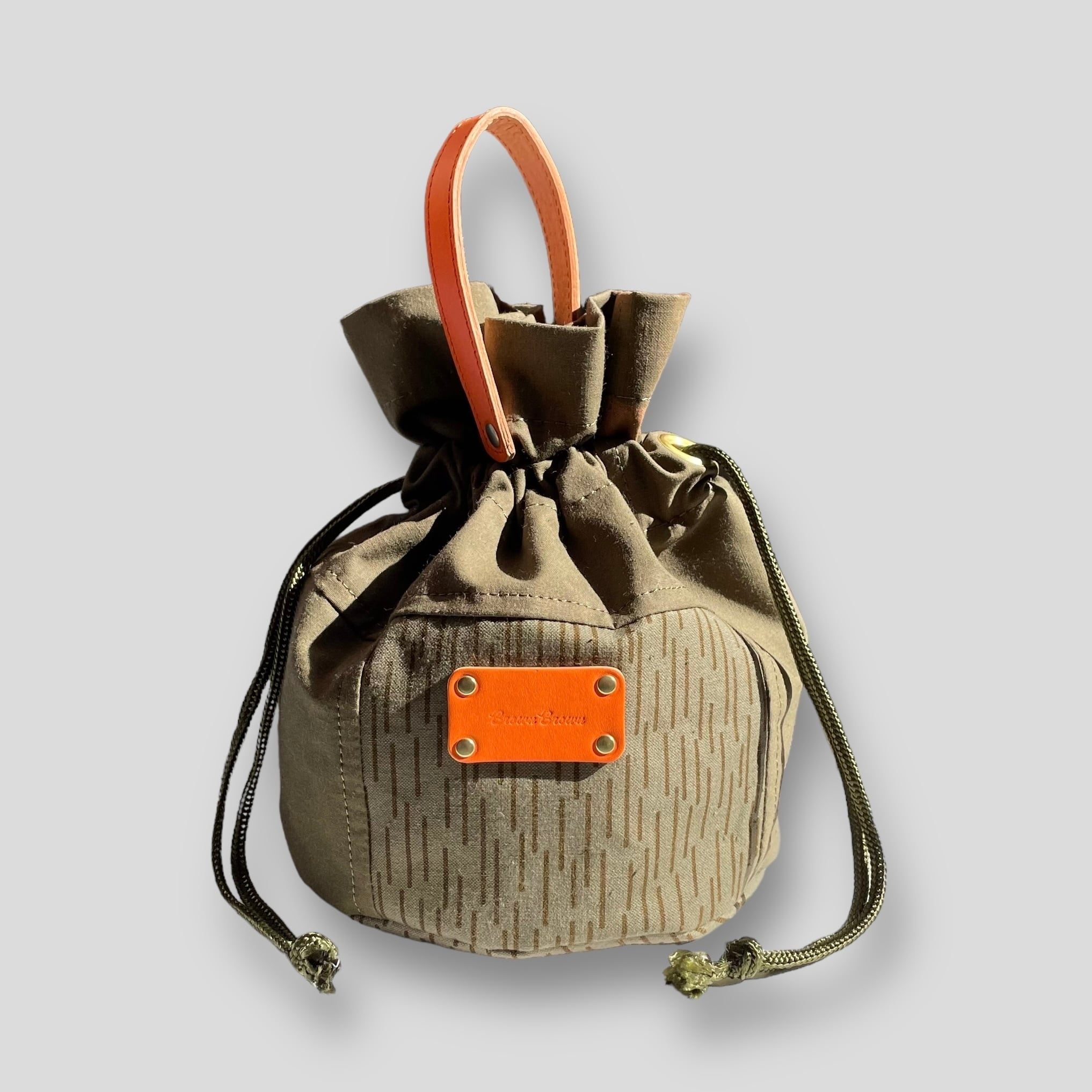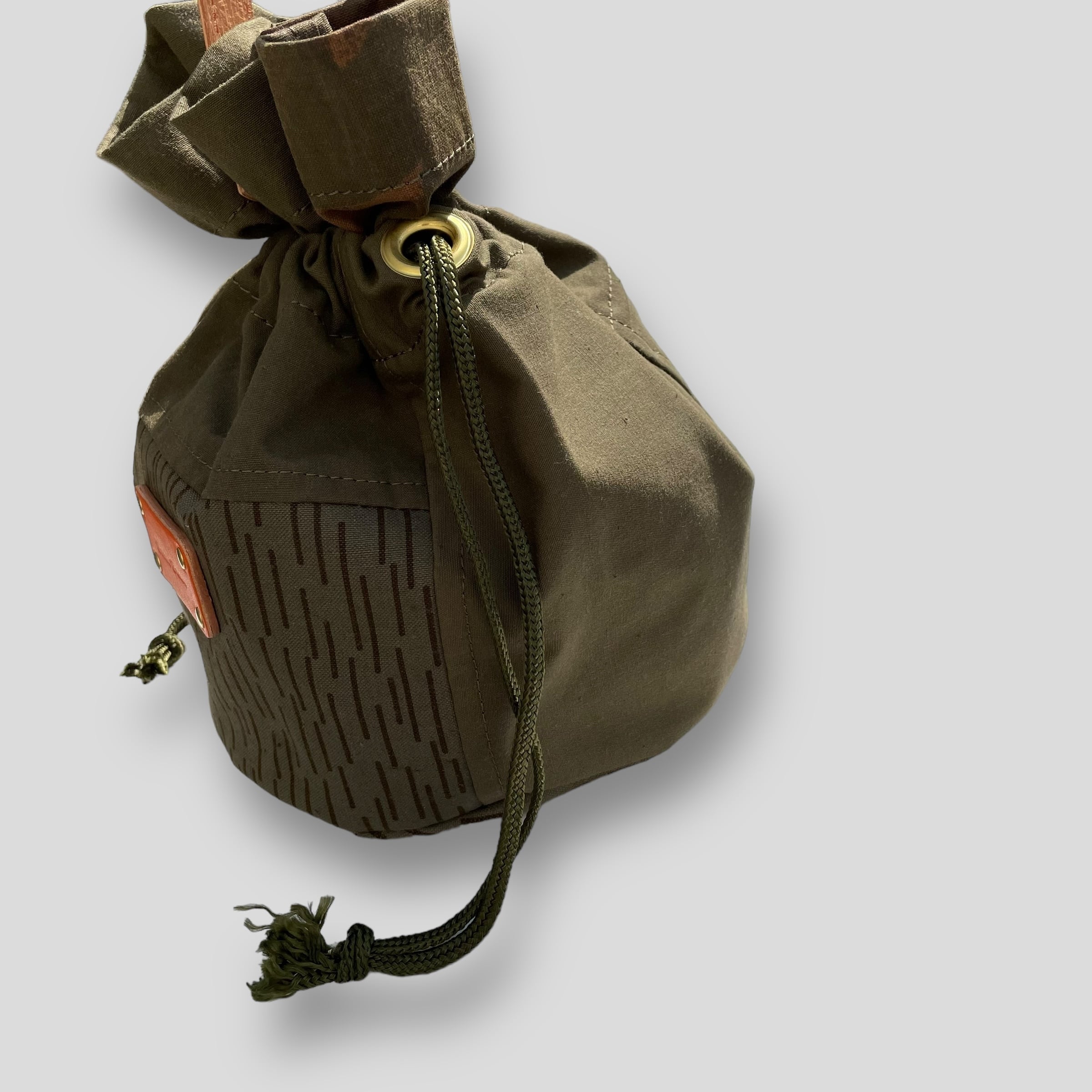 3種類のテント生地をツギハギに縫い合わせたハンドル巾着バッグ。