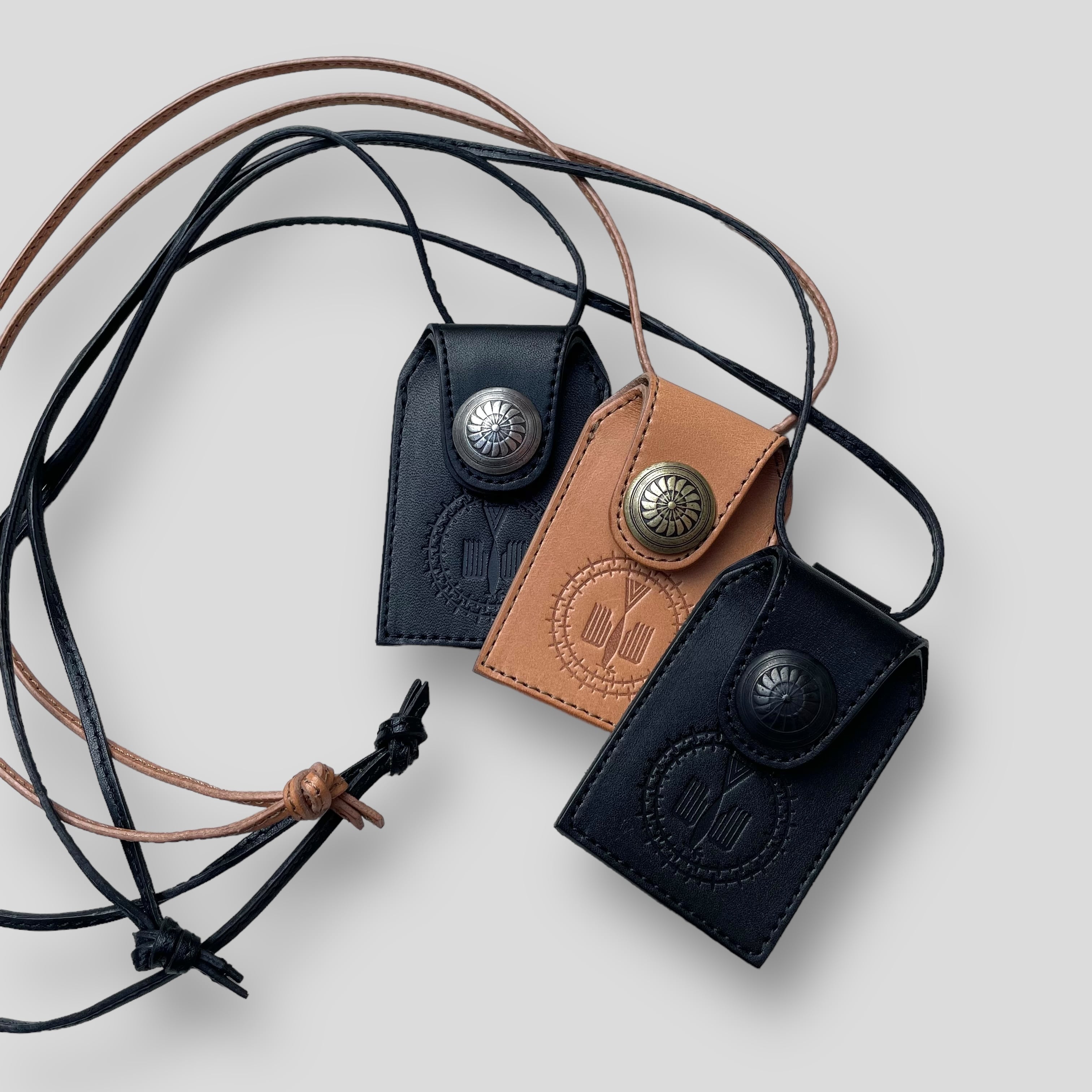 日本古来からの携帯アイテムである、お守りを、十字のネックレスの様に、首からぶら下げるスタイルでコーディネートする為のケース。
