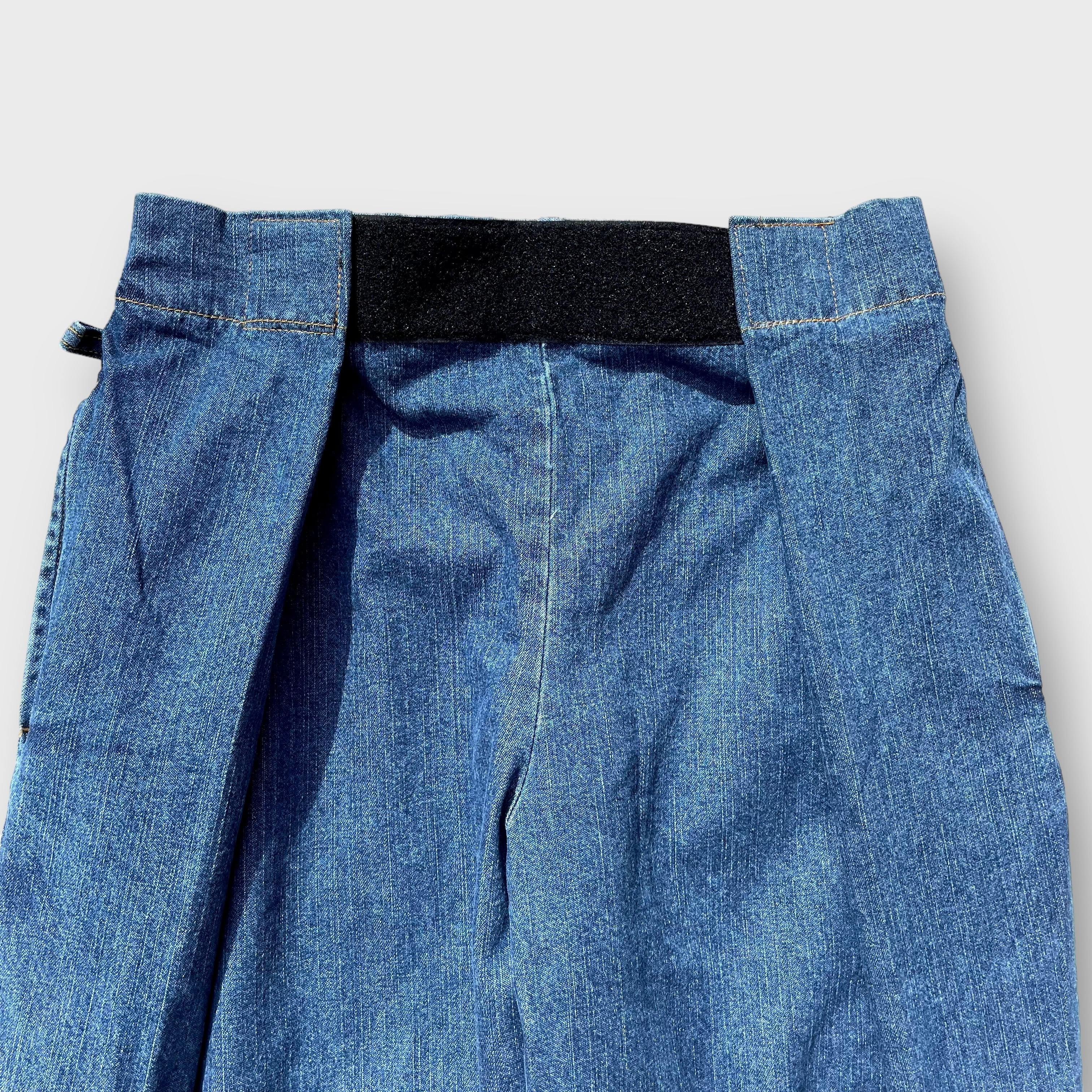 ウエストがマジックテープで調節ができて、後ろ身頃は太いゴムになってて半分イージーパンツのように簡単に着脱できます。