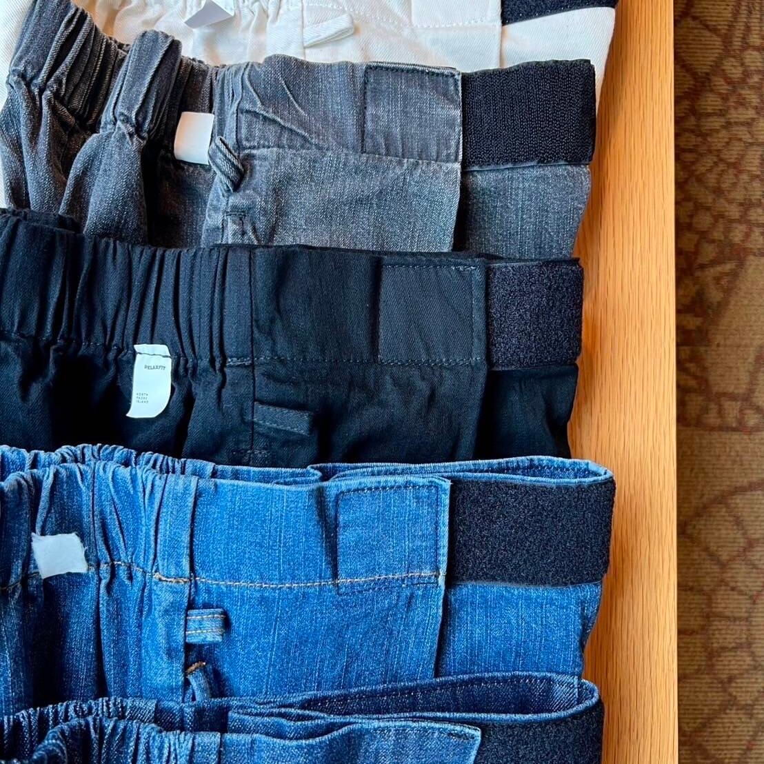 ウエストがマジックテープで調節ができて、後ろ身頃は太いゴムになってて半分イージーパンツのように簡単に着脱できます。