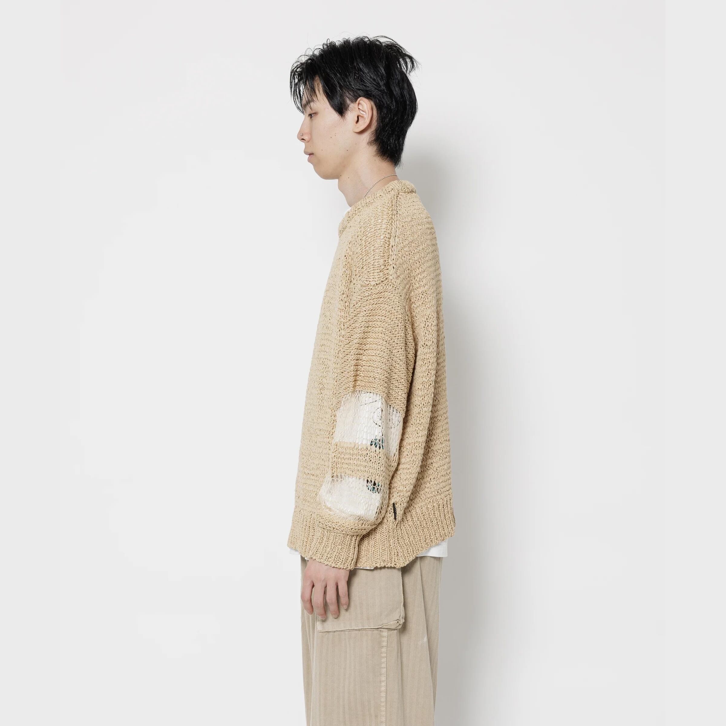 太番手のテープヤーンの表目と裏目のパーツを組み合わせ、袖にはコイルヤーンの編み地を入れて立体感を演出。